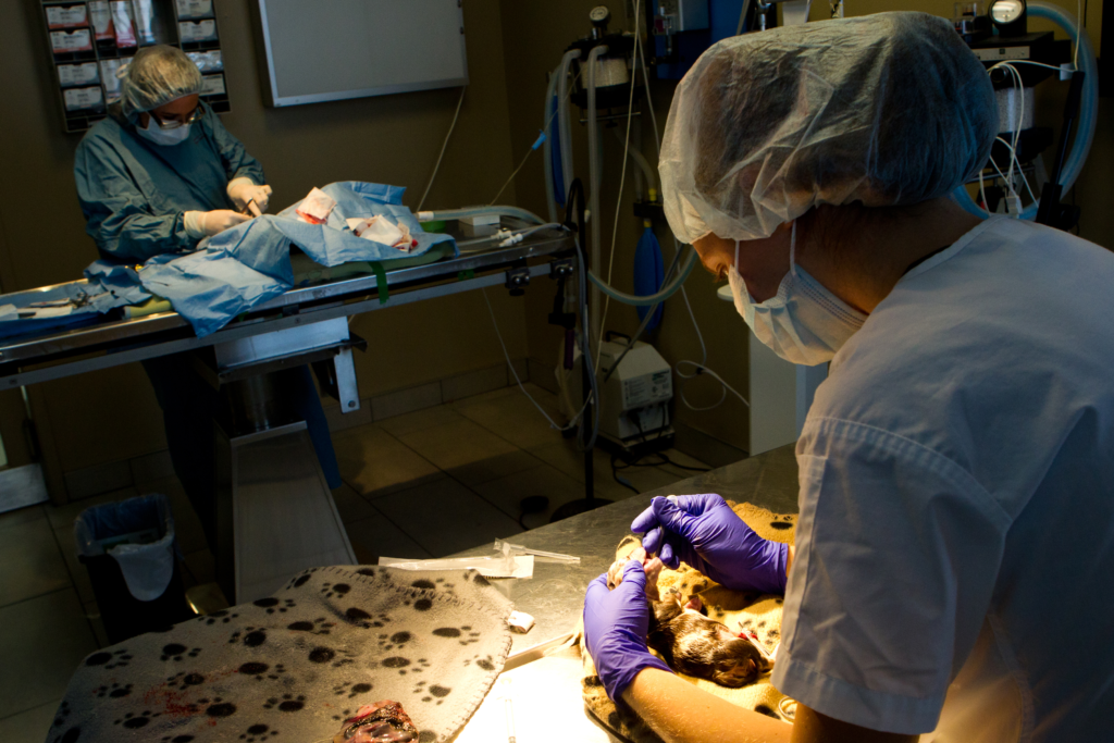 Après une césarienne ou un accouchement difficile, le personnel vétérinaire assure la réanimation des chatons et veille à ce qu’ils s’alimentent correctement avant le réveil complet de la mère.